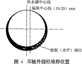 對(duì)煉鐵廠100 t鐵水罐的耳軸磨損進(jìn)行了分析,通過(guò)耳軸彎曲強(qiáng)度核算,確認(rèn)需修復(fù)磨損量。通過(guò)對(duì)焊縫強(qiáng)度校核,證明更換耳軸的方案不可行,從而選用耳軸表面堆焊的處理工。焊后采用退火處理,以消除焊接殘余應(yīng)力,效果良好。